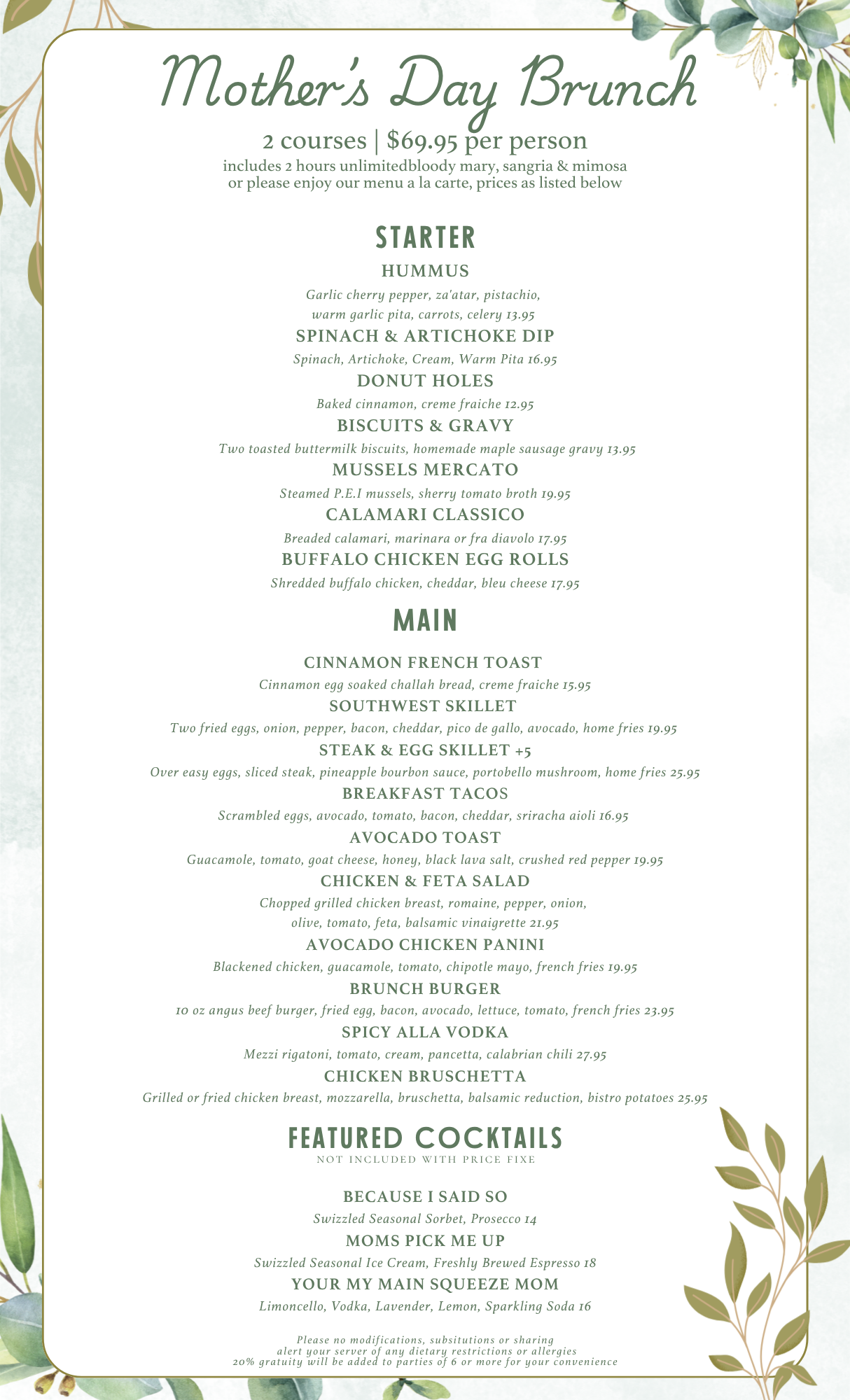 Gather with family and friends and enjoy a thoughtfully curated 2-course brunch menu plus two hours of unlimited Bloody Marys, sangria, and mimosas (21+).