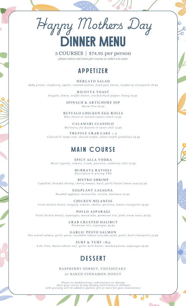 Enjoy a thoughtfully prepared 3-course prix fixe menu featuring seasonal favorites and chef-driven specialties, perfect for gathering around the table with family and loved ones. Guests may select one item per course or order à la carte from the menu.